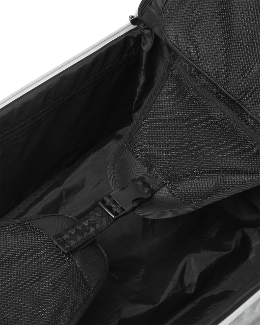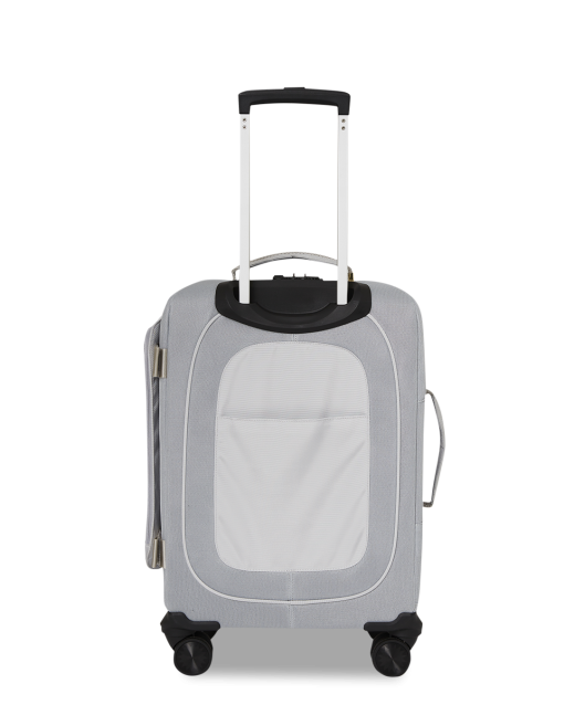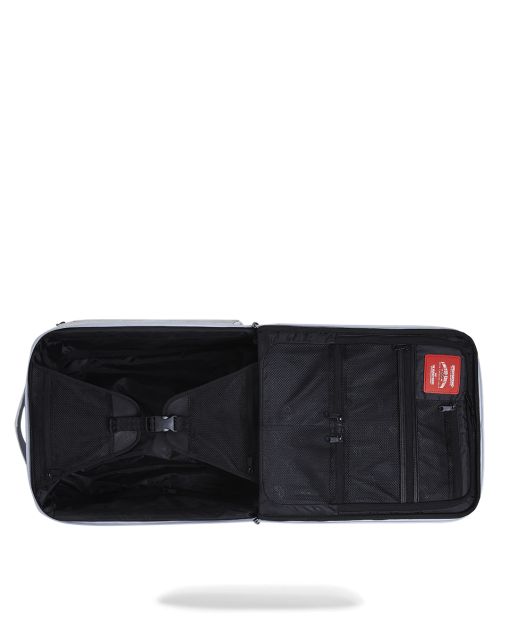 EXTERIOR:100 % Polyvinyl Chloride Shell – AKA 100% Faux Leather H: 19.5” x W: 14.5“x D: 7” YKK® Zipper FrameFront Exterior PocketEmbossed LogoFaux leather top & side handles 4 Dual Spinning Recessed WheelsTelescope Adjustable Handle – 2 positions INTERIOR:Multiple Pockets and Compartments for Maximum Organization3 Zippered Pocket4 Mesh PocketsShark Print Satin LiningMesh organizer pockets Fastening StrapsNylon Zippers with Metal Hardware
