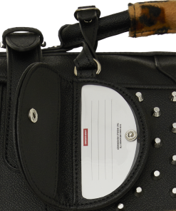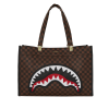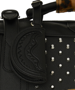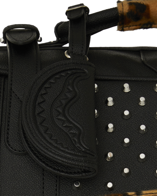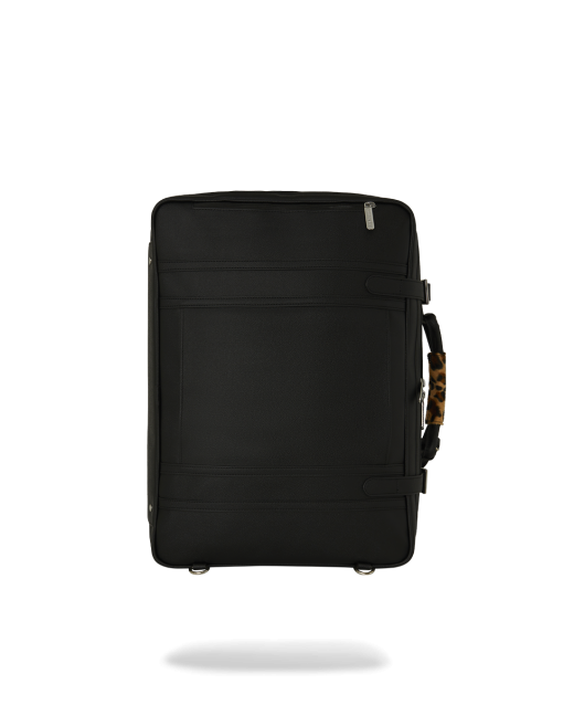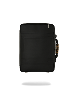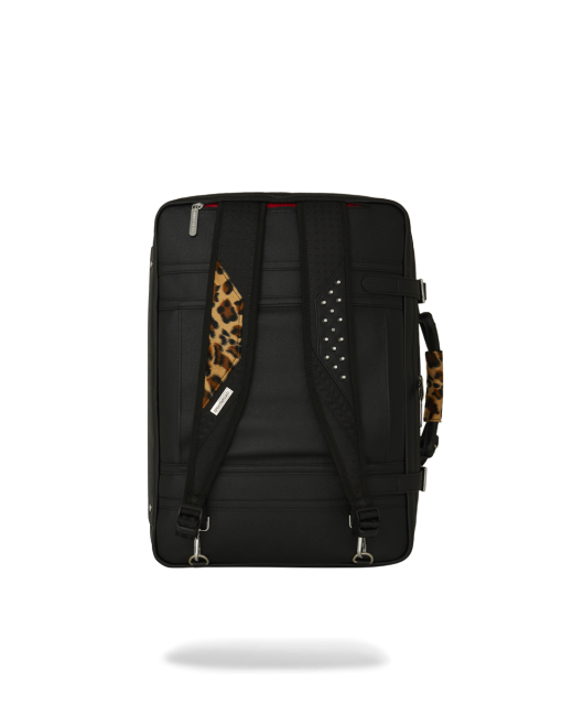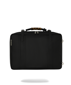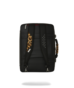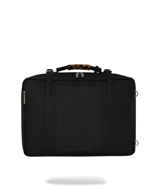 Features: Leather handle, secure buckle closure, whip stitching features, vertical sharkmouth embossed details, converts from backpack to handheld briefcase, embossed sharkmouth, includes luggage tag, 2 exterior zipper pockets, luggage sleeve, 4 interior mesh pockets, large interior pocket, clothing compression straps, includes adjustable backpack straps, embossed zipper pulls.