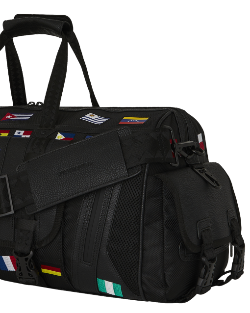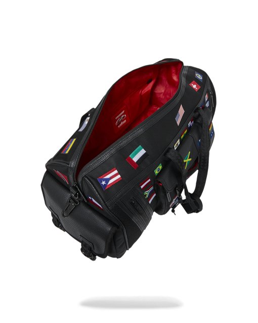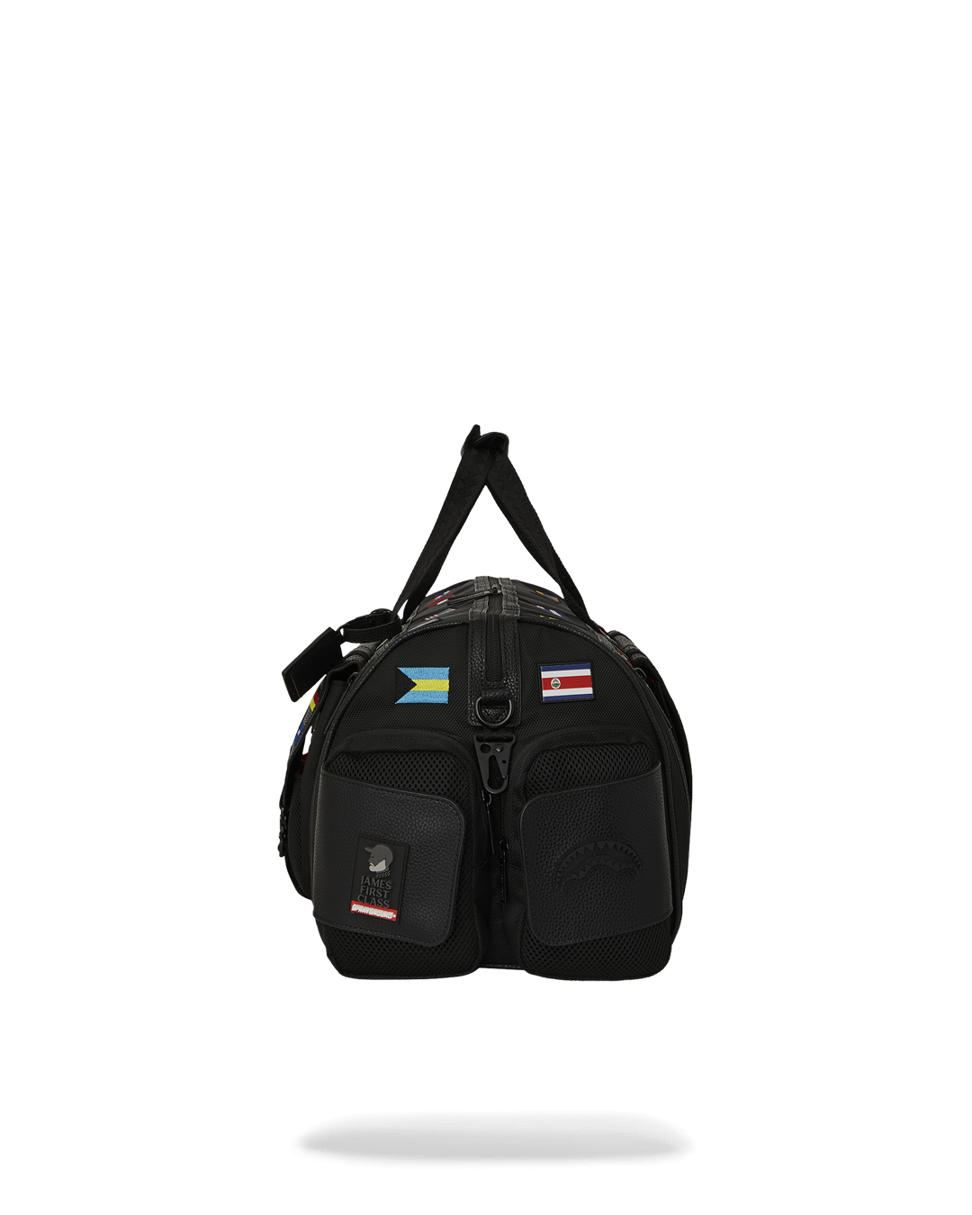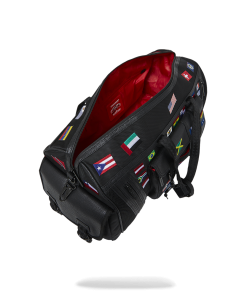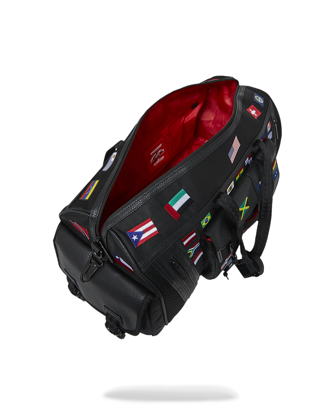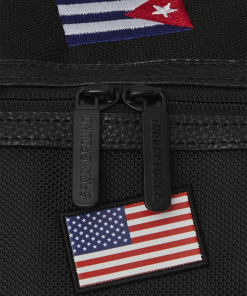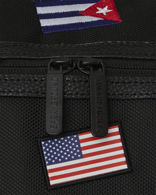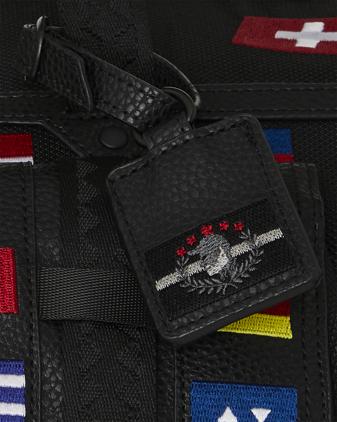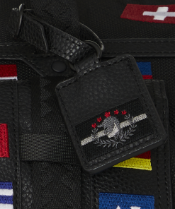 100% ballistic polyester embroidered with flag patches and embossed details such as the sharkmouth and zipper pullers. Sewn faux leather details around the front zipper pocket.