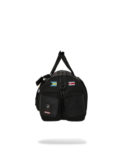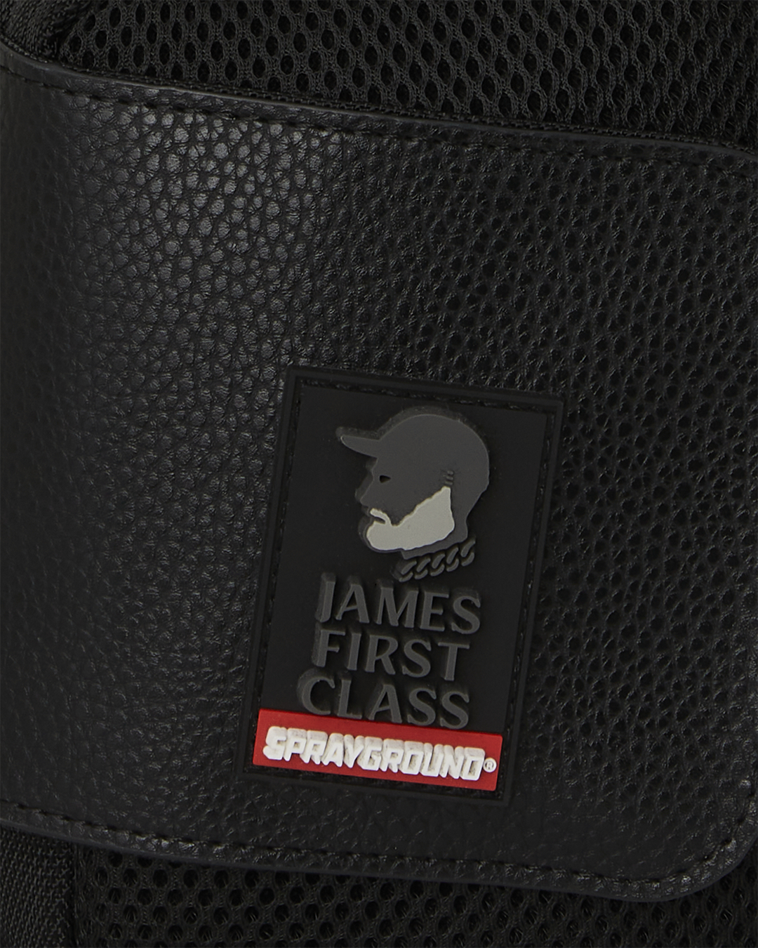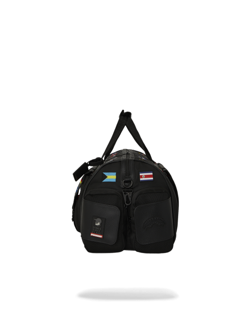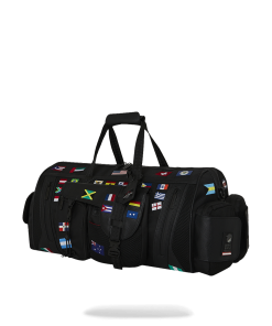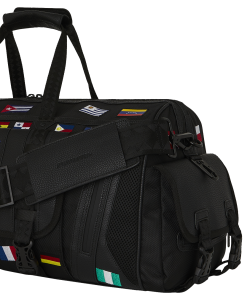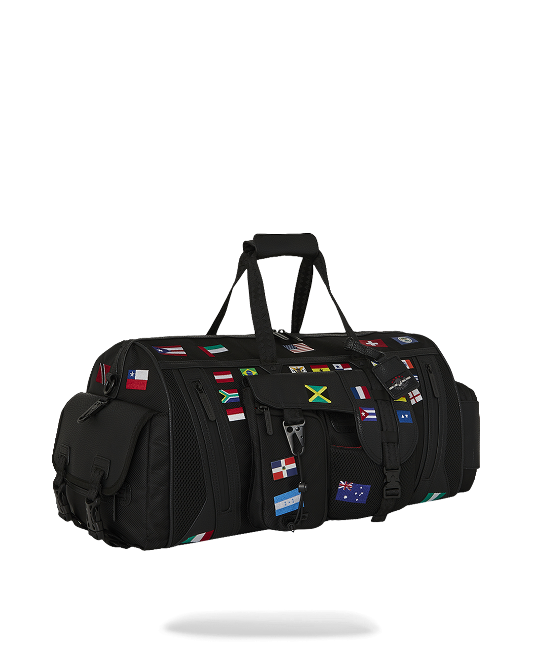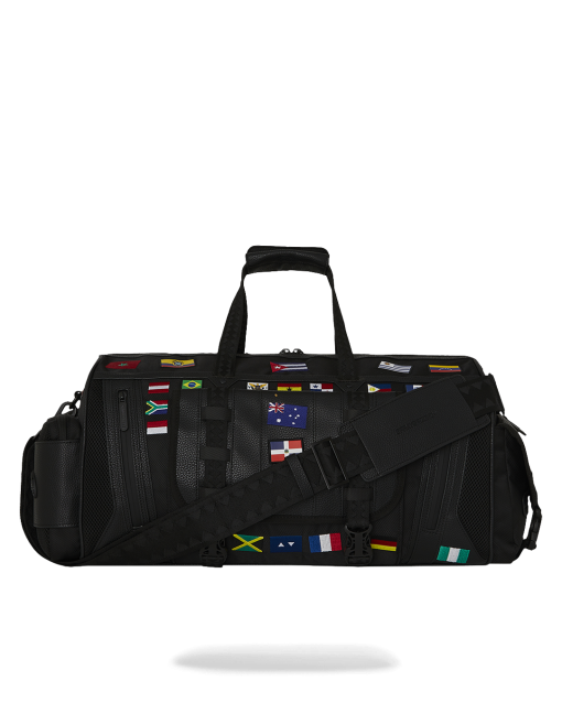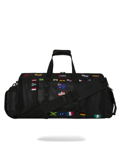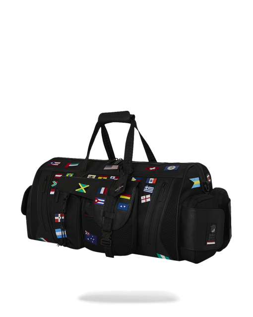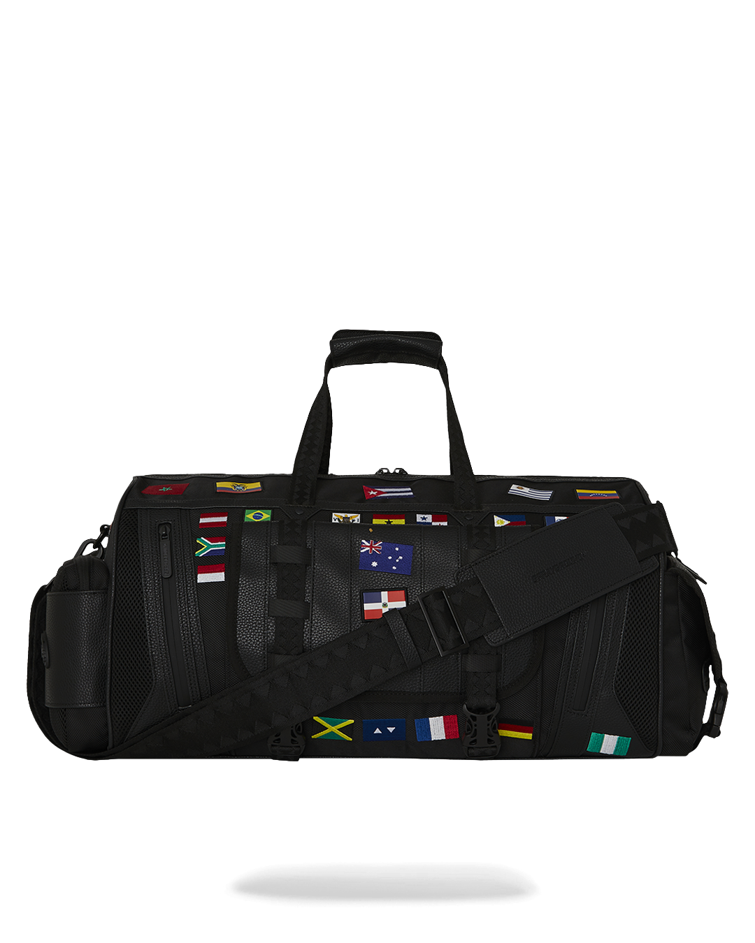 100% ballistic polyester embroidered with flag patches and embossed details such as the sharkmouth and zipper pullers. Sewn faux leather details around the front zipper pocket.