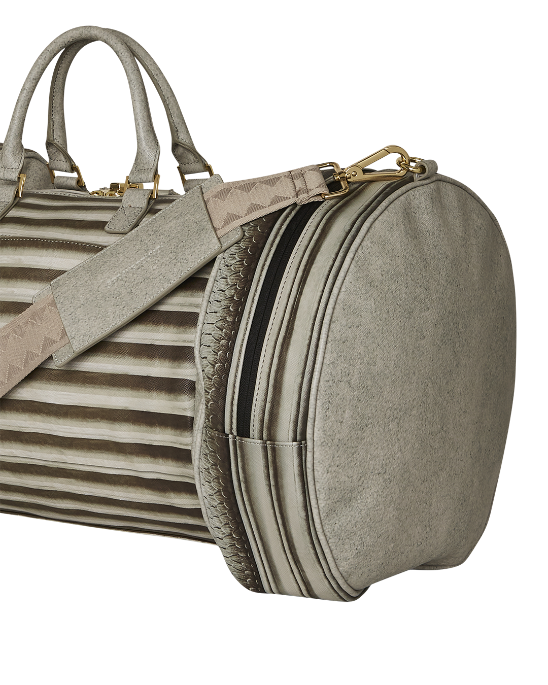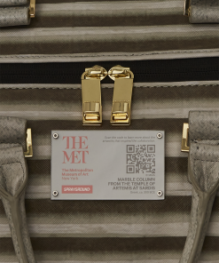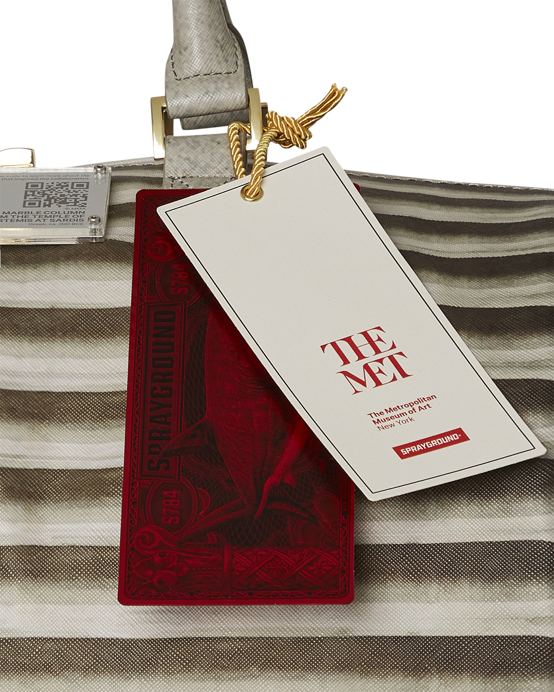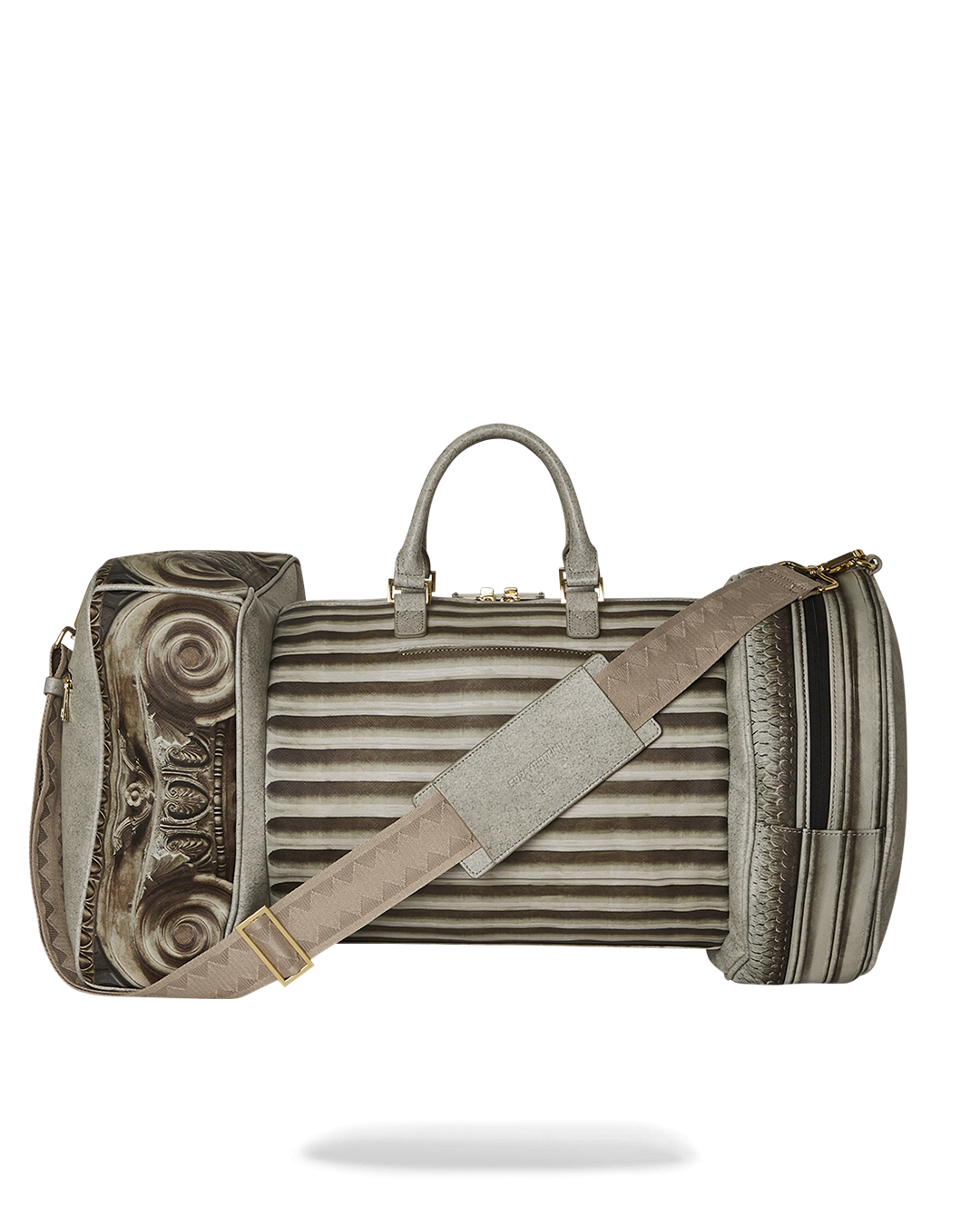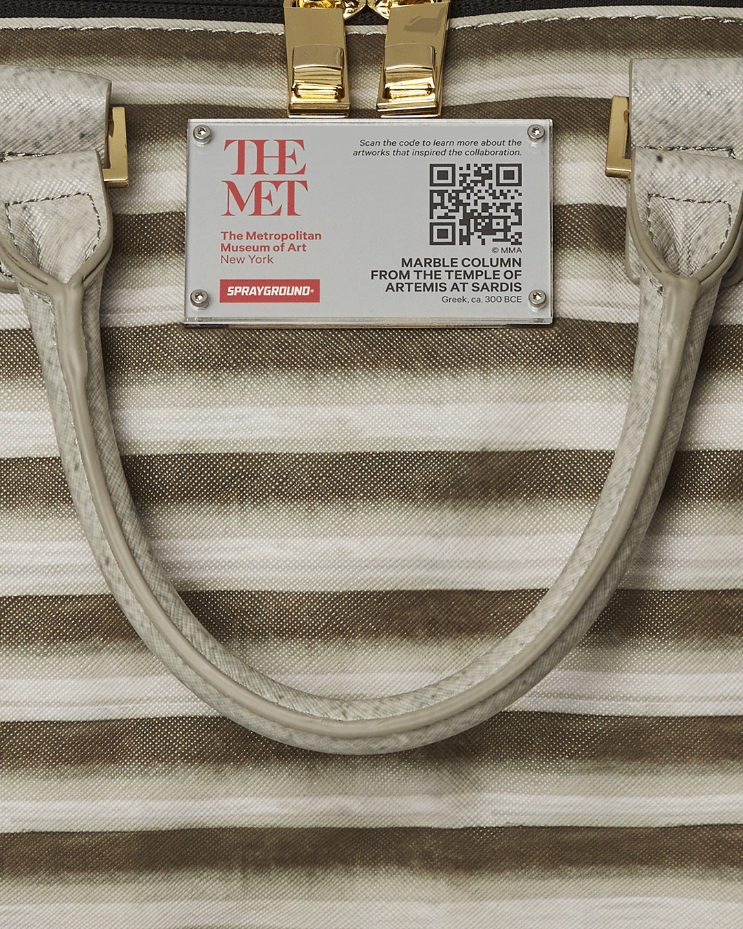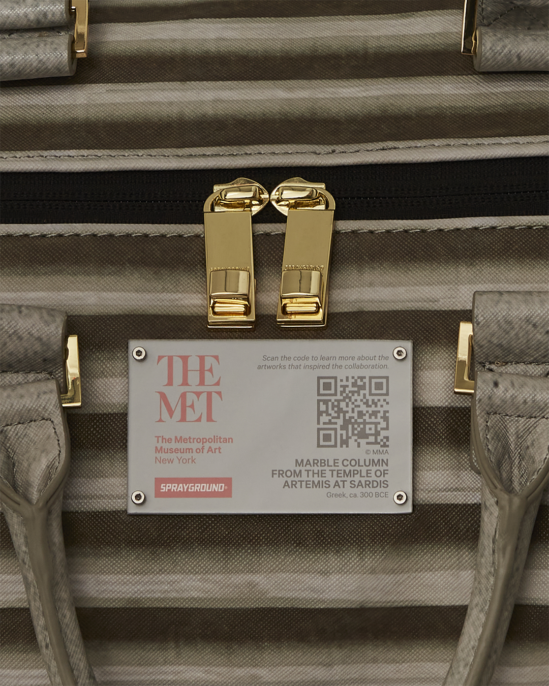 The massive section of a column (ca. 300 BCE) from the Greek Temple of Artemis at Sardis is transformed into a Sprayground duffle bag. The column has been turned on its side and adapts the delicate foliate carvings on its capital—a unique characteristic among extant capitals from the temple. Though the original column once towered at over 58 feet high, its capital is slightly smaller than others found at the site. Dimensions: 24″ x 12″ x 13.75″